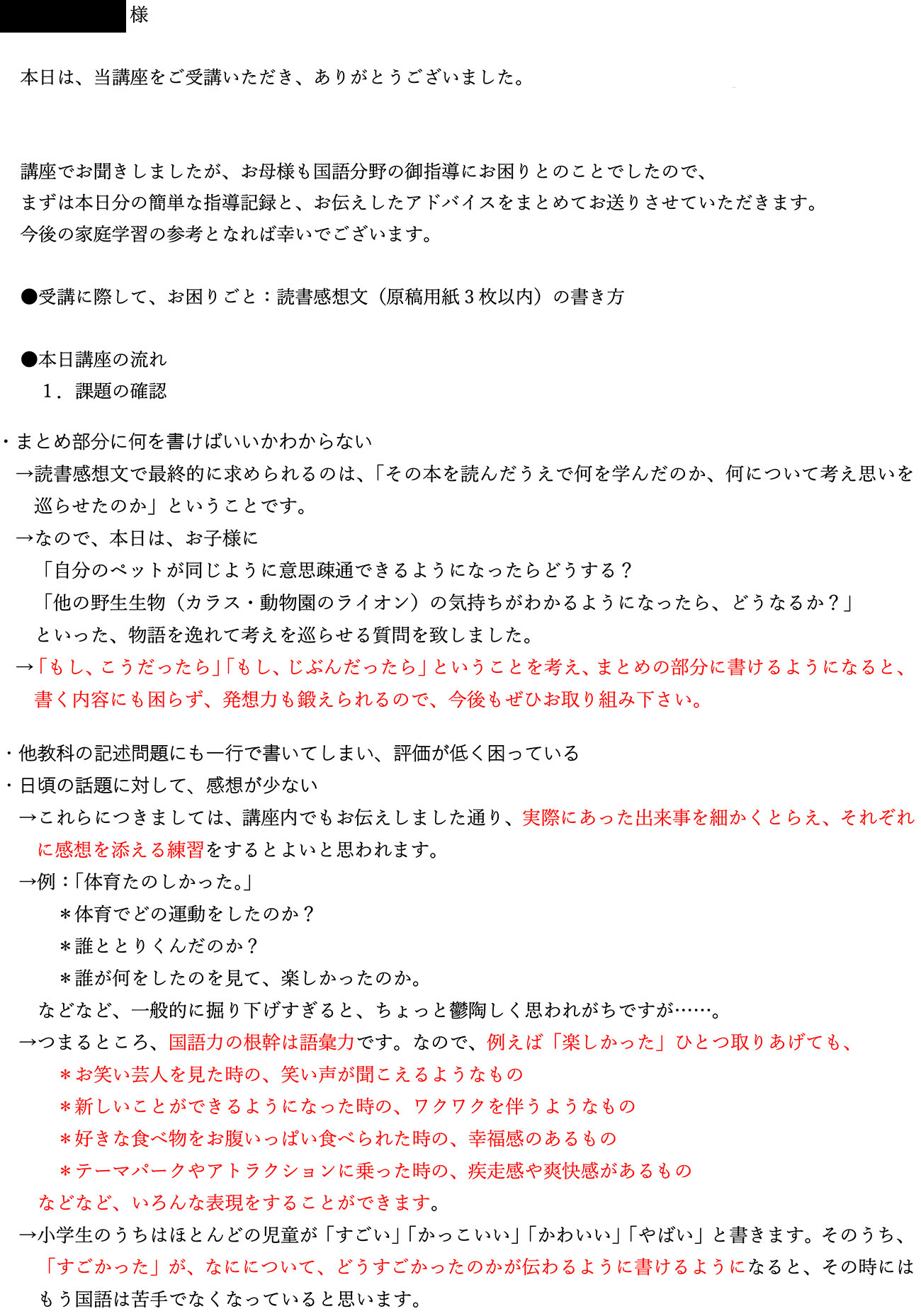 受講後に保護者の方にお渡しした、アフターフォローの一例です。